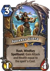 I like Speaker Gidra. She’s like a Siamat, but less flexible, but more flexible. Wait, what? Okay, so she’s less flexible, because you can’t pick Taunt or Divine Shield options – it’s always Rush + Windfury (which is not a bad combo in Siamat, although Rush + DS is usually better). On the other hand, it’s more flexible, because you can adjust the cost to your needs etc. Siamat is 7, end of story. This can be a 5 mana 3/6 with Rush + Windfury. Or 7 mana 5/8 (which is a better stat-line than Siamat, notably). Or a 10 mana 8/11. That’s what I like about it – the card is good throughout the mid and late game. Heck, sometimes just dropping it on 3 to clear a 2/1 and 1/1 is not that bad.