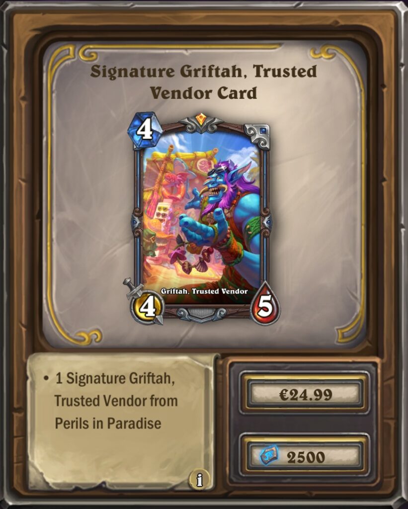 - Signature Legendary Griftah, Trusted Vendor (2500 Runestones or $25) – Signature version of the Griftah, Trusted Vendor Legendary card from the Perils in Paradise expansion. Do note that the card rotates out of Standard soon.