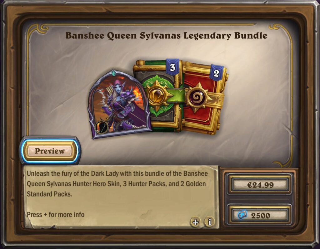 - Banshee Queen Sylvanas Legendary Bundle (2500 Runestones or $25) – New Legendary Hunter skin + 3 Hunter card packs + 2 Golden Standard card packs.