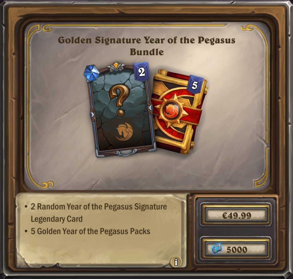 - Golden Signature Year of the Pegasus Bundle (5000 Runestones or $50) – Two random Signature Legendary cards from Year of the Pegasus (2024) + 5 Golden Year of the Pegasus card packs.