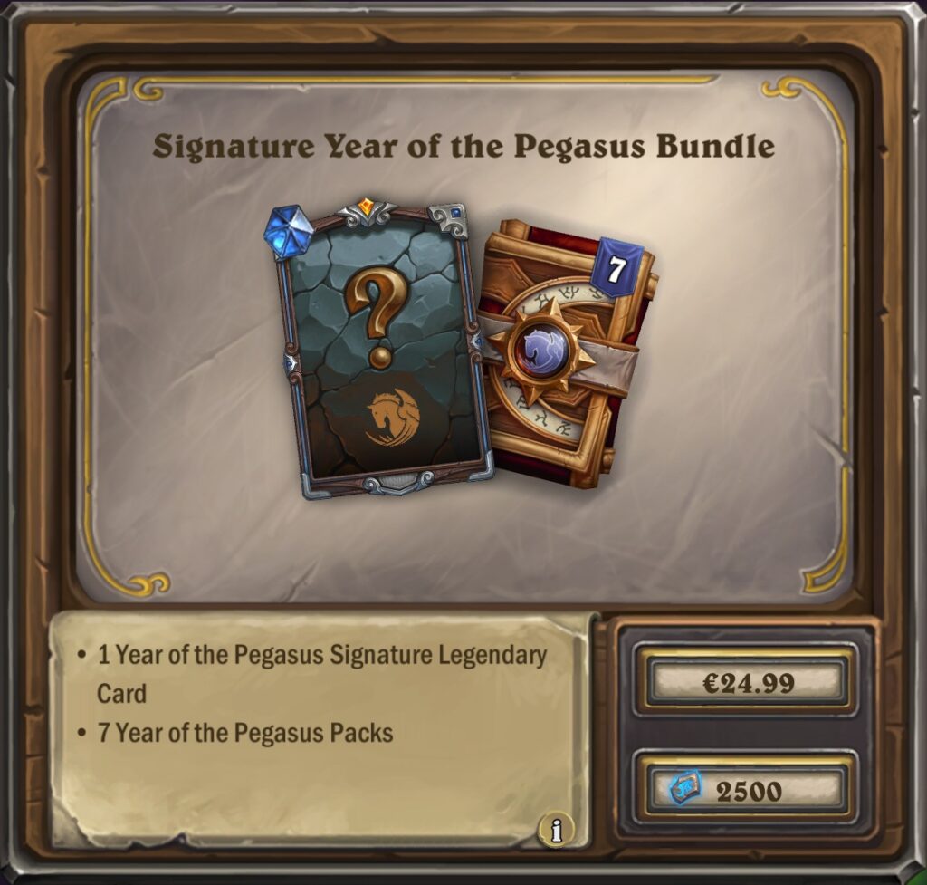 - Signature Year of the Pegasus Bundle (2500 Runestones or $25) – Random Signature Legendary card from Year of the Pegasus (2024) + 7 Year of the Pegasus card packs.