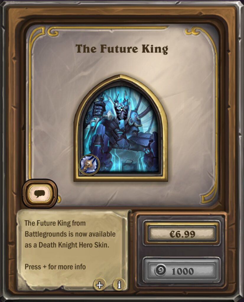 - The Future King (1000 Gold or $7) – “Returning” lite Death Knight skin. Originally available in Battlegrounds game mode.