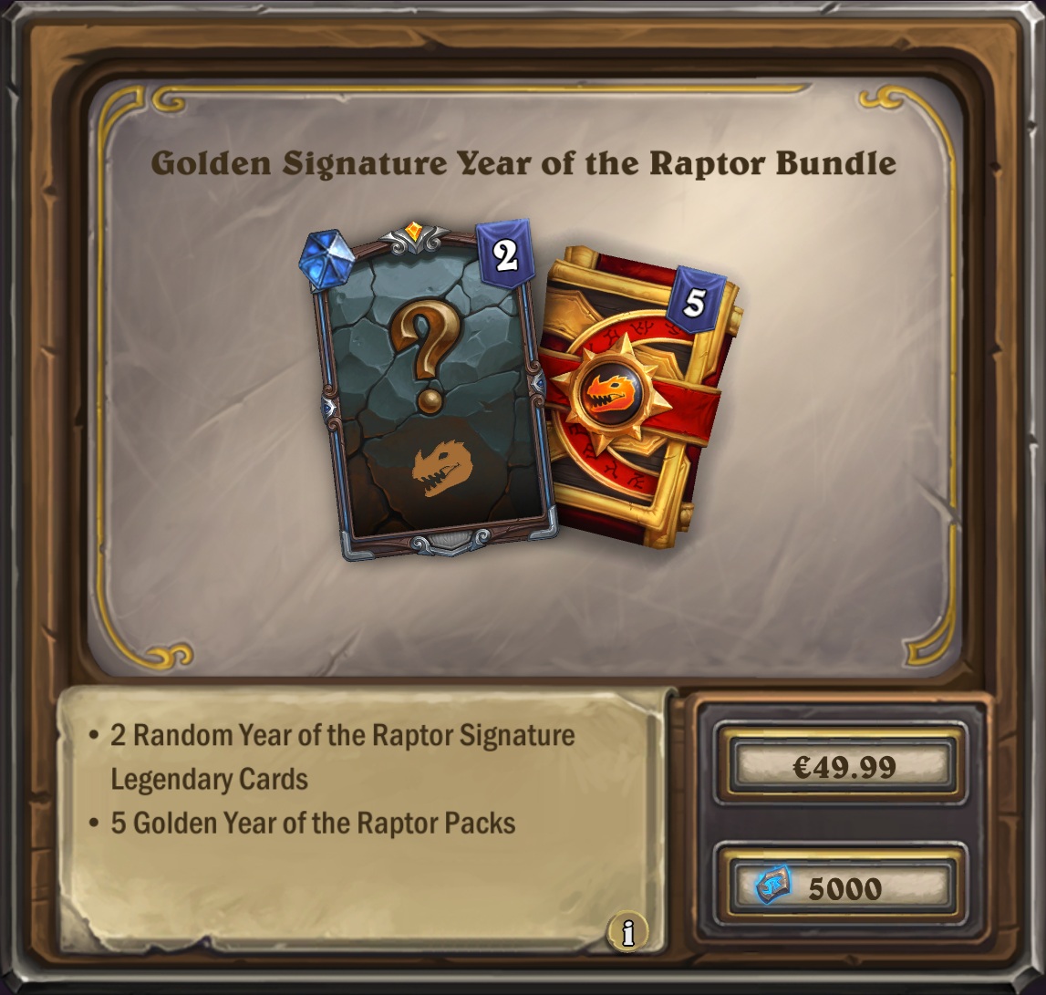 - Golden Signature Year of the Raptor Bundle (5000 Runestones or $50) – Two random Signature Legendary cards from Year of the Raptor (2025) + 5 Golden Year of the Raptor card packs.