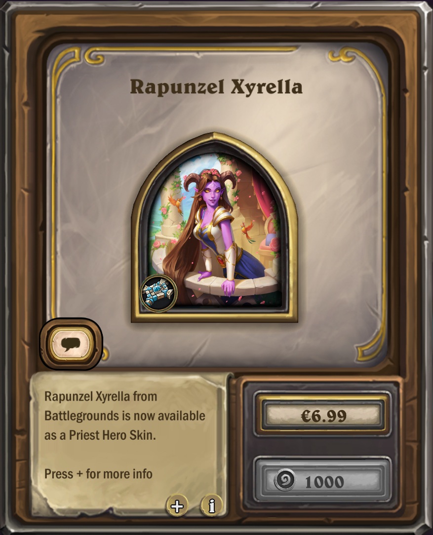 - Rapunzel Xyrella (1000 Gold or $7) – “Returning” lite Priest skin. Originally available in Battlegrounds game mode.