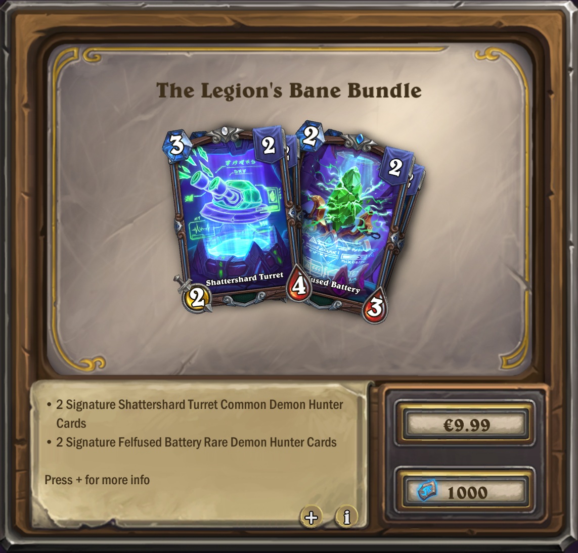 - The Legion’s Bane Bundle (1000 Runestones or $10) – Returning Signature card bundle with 2x Felfused Battery and 2x Shattershard Turret. Originally available in November 2024 for $35 (with 5 extra card packs).