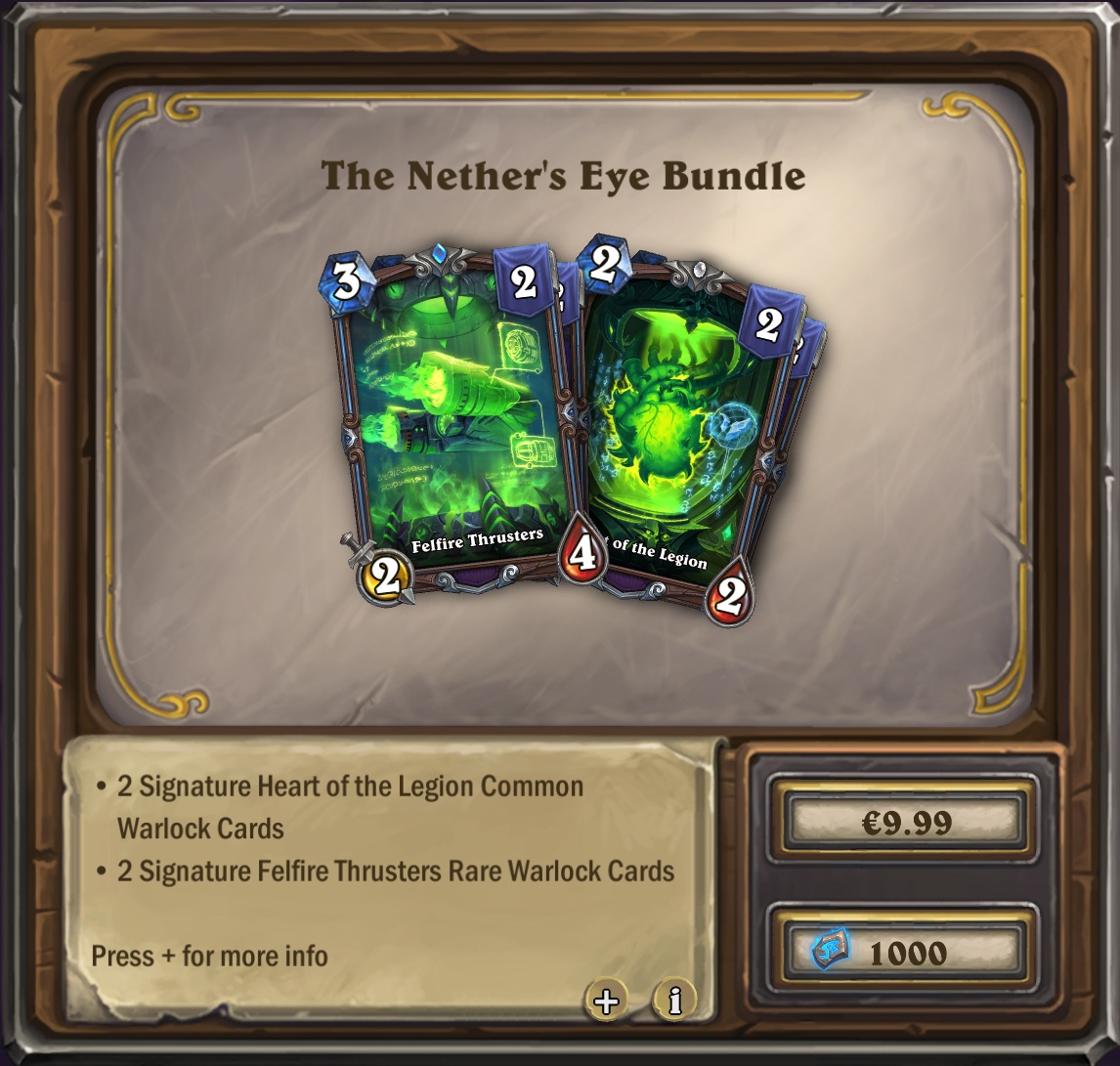 - The Nether’s Eye Bundle (1000 Runestones or $10) – Returning Signature card bundle with 2x Felfire Thrusters and 2x Heart of the Legion. Originally available in November 2024 for $35 (with 5 extra card packs).