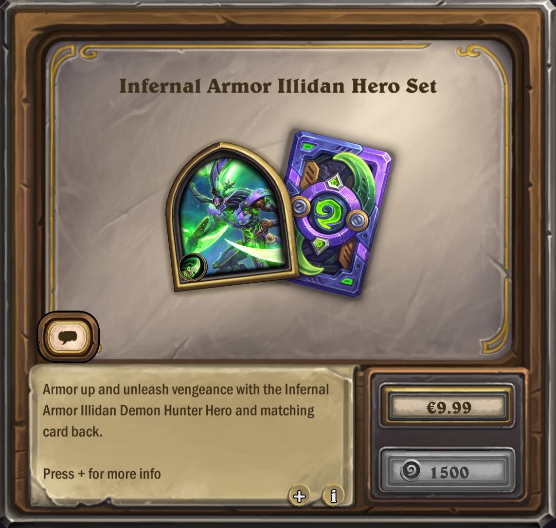 - Infernal Armor Illidan Hero Set (1500 Gold or $10) – Returning full Demon Hunter skin with a card back. Originally from a shop bundle in November 2021.