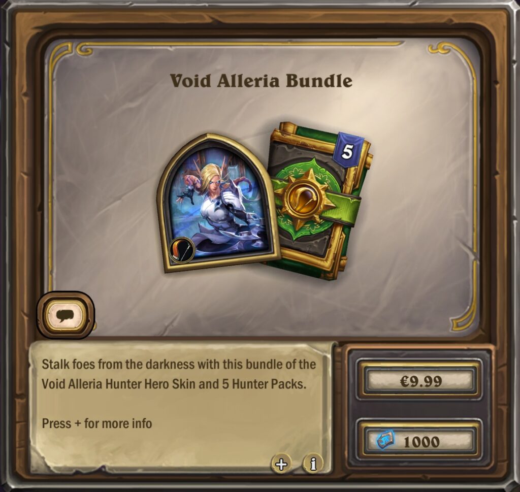 - Void Alleria Bundle (1000 Runestones or $10) – New lite Hunter skin + 5 Hunter card packs.