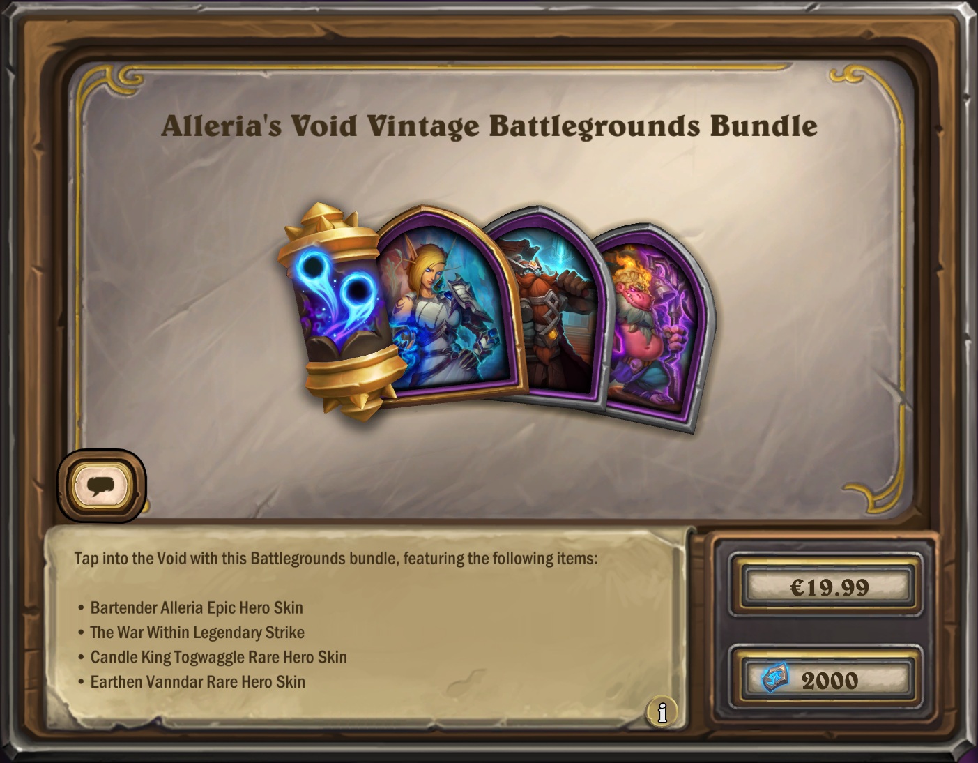 • Alleria’s Void Vintage Battlegrounds Bundle (2000 Runestones or $20) – Epic Alleria Bartender + The War Within Legendary Strike + 2 Rare Hero skins.