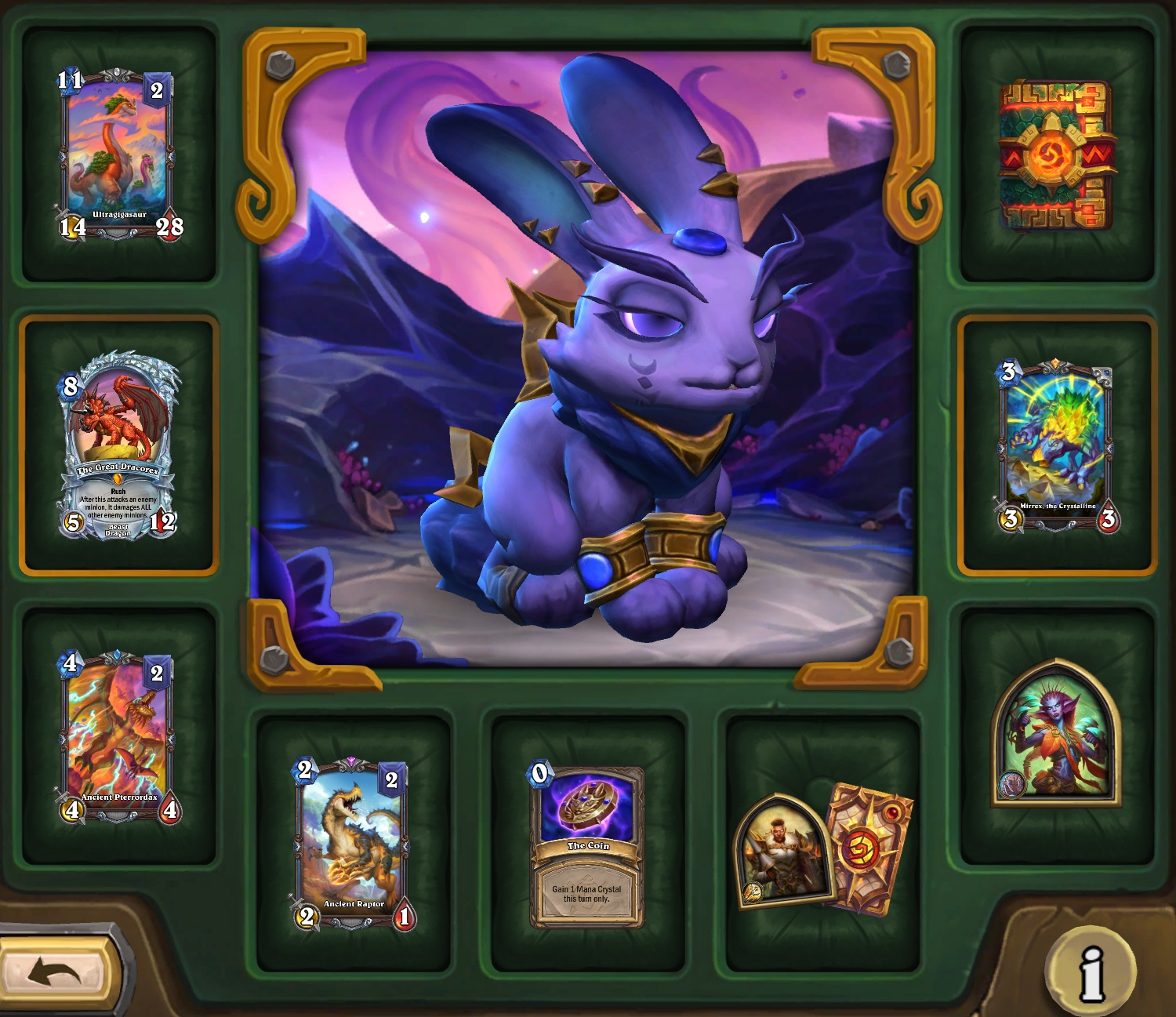 • Darkmoon Faire Treasures Rabbit’ath (all rolls cost 15,800 Runestones or $158) – Each roll gives you a random prize, from 1 Golden Un’Goro pack or Common Signature Card, all the way to Rabbit’ath Pet. First roll is free, then the cost increases each time. Rewards are weighted – for example, on your first roll you have 30% chance to get Signature Common, 28% to get a pack, 2.5% chance to get Signature Legendary, and only 0.1% chance to get the pet. You can find a full list of odds here (under “Darkmoon Faire Treasures” tab).