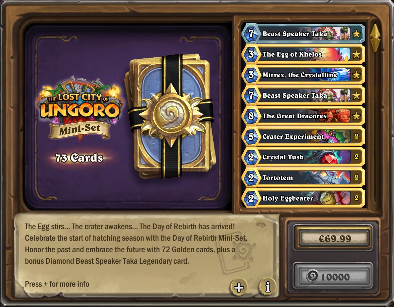 • Golden Day of Rebirth Mini-Set (10,000 Gold or $70) – A new mini-set with 38 unique cards in their Golden versions + diamond version of Beast Speaker Taka. You can find a full list of cards here.
