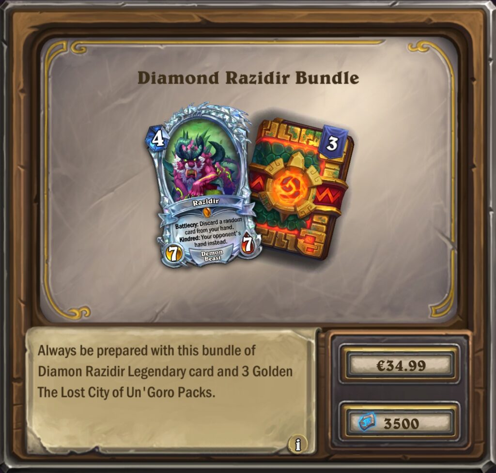 • Diamond Razidir Bundle (3500 Runestones or $35) – Diamond version of Razidir + 3 Golden Lost City of Un’Goro card packs.