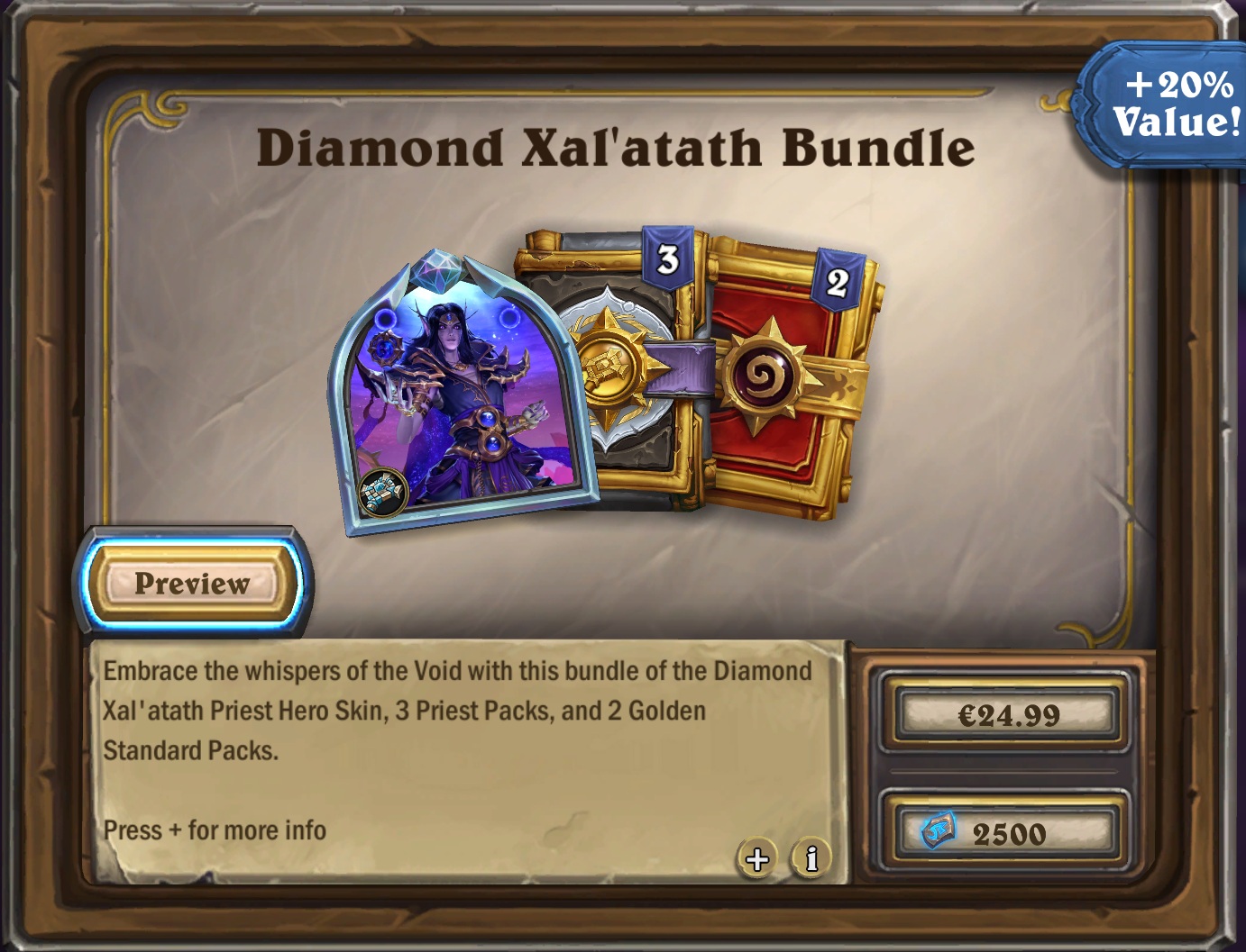 • Diamond Xal’atath Bundle (2500 Runestones or $25) – New Diamond Priest skin + 3 Priest card packs + 2 Golden Standard card packs.