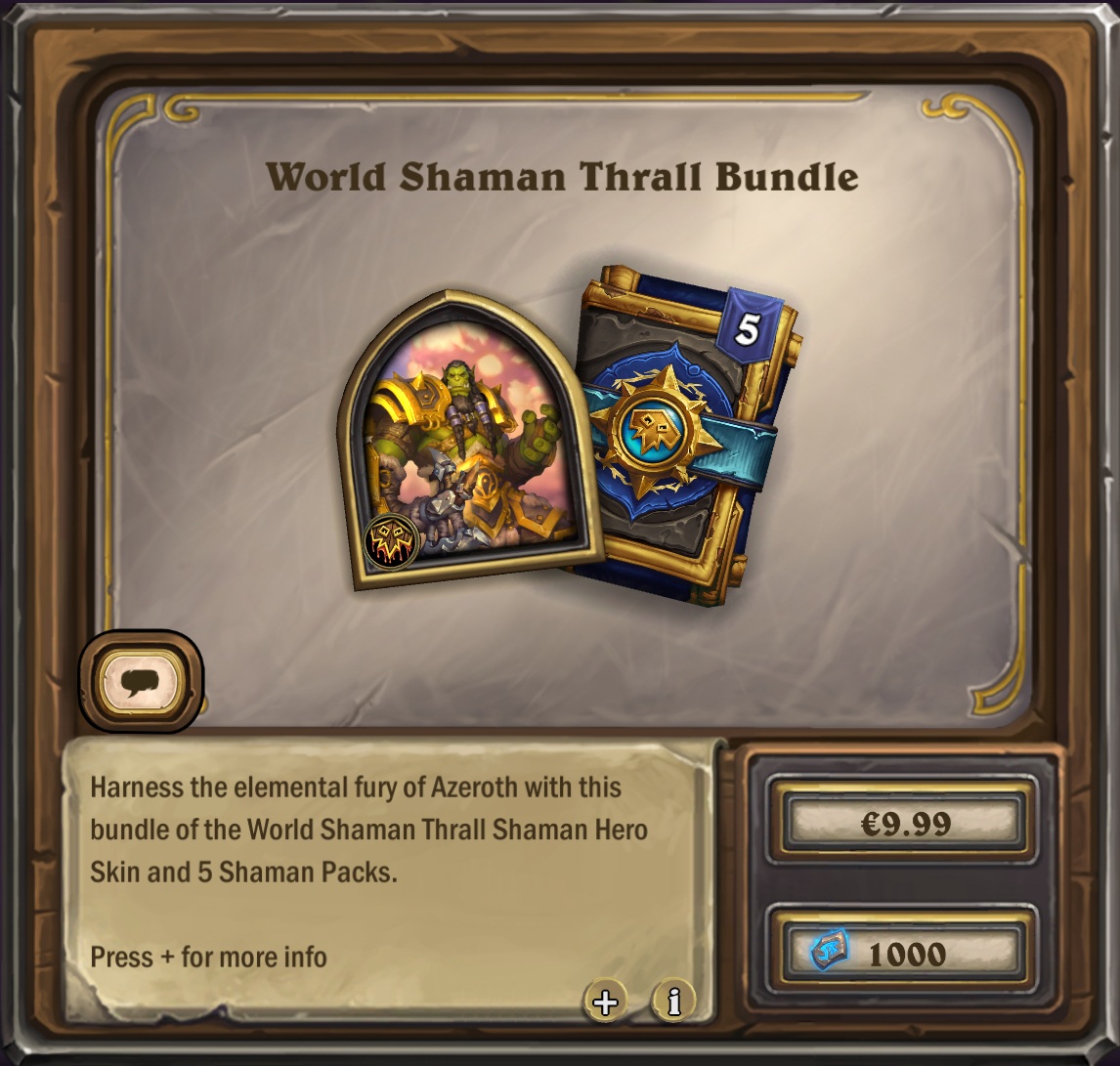 • World Shaman Thrall (1000 Runestones or $10) – New lite Shaman skin + 5 Shaman card packs.