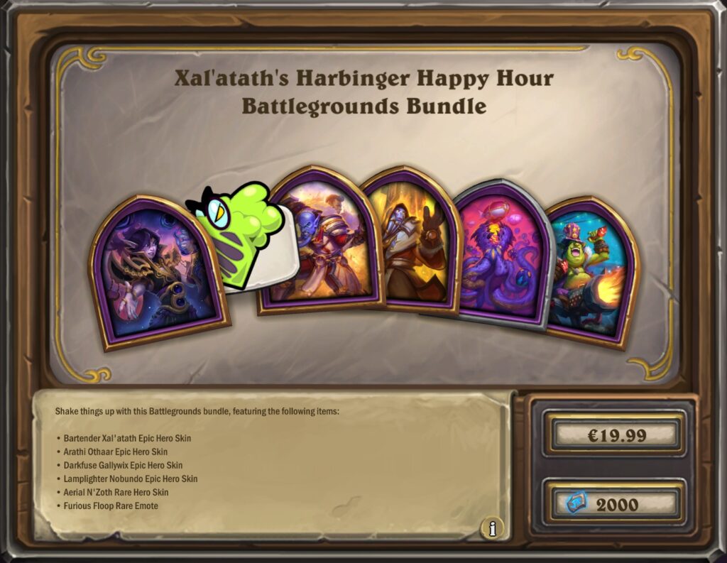 • Xal’atath’s Harbinger Happy Hour Battlegrounds Bundle (2000 Runestones or $20) – Epic Xal’atath Bartender + 3 Epic Hero skins + 1 Rare Hero skin + 1 Rare emote.