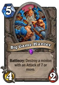 The list will have a bunch of pre-nerf card, and Big Game Hunter is one of them. The current 5 mana version sees play sometimes, in decks that lack removal or maybe when the meta is heavy on big minions. However, imagine that the card used to cost 3 mana with the exact same stats and same effect before. Yes, it was a really, really powerful tech.