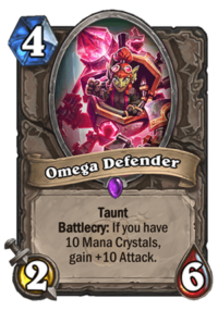 Omega Defender is a really, really powerful Arena card. I mean, Stegodon is an okay 4-drop to pick. It’s above average, and Arena decks are filled with above average cards. So you basically get a Stegodon that gets a MASSIVE boost in the late game. Not only it’s a solid card on the curve, but it becomes a game-winning topdeck.